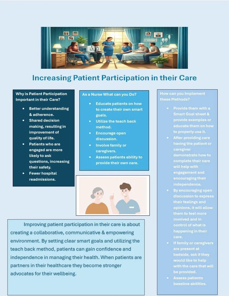 My classmate and I developed and presented this project to teach patients the importance of being active participants in their care. The project highlighted how strategies like SMART goals, the teach‑back method, open discussion, and family involvement can improve understanding, safety, and independence.